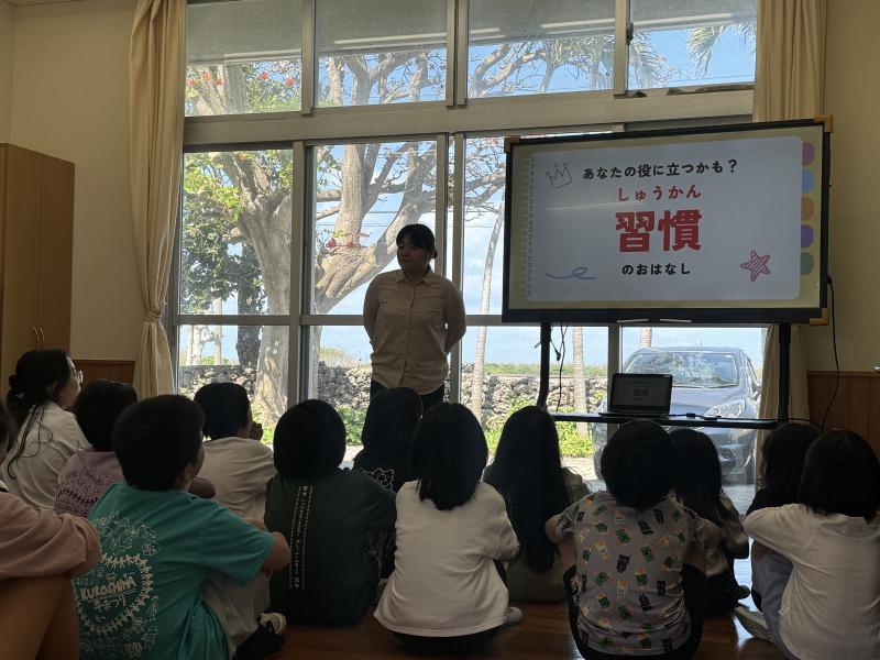 3月16日(月)のお昼の集会では、事務の里菜さんが自身の経験を交えてお話をしました。テーマは「習慣化の大切さと難しさ」。高い目標も、日々の小さな積み重ねがあってこそ。思うようにいかない日があっても、諦めずに続けるコツを伝えてくれました。子供たちにとって、自分自身の「継続する力」を振り返る貴重な時間となりました。里菜さん素敵なお話をありがとうございました。
