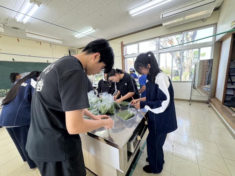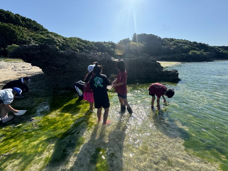 青空の下、子どもたちは岩場に広がる鮮やかな緑に目を輝かせ、夢中で手を動かしていました。一生懸命にざるをいっぱいにしようとする姿がとても印象的で、島の宝物に触れる素敵な時間となりました。