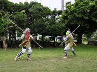 男女とも、クワや斧を持って島の伝統的な踊りを披露しました。
